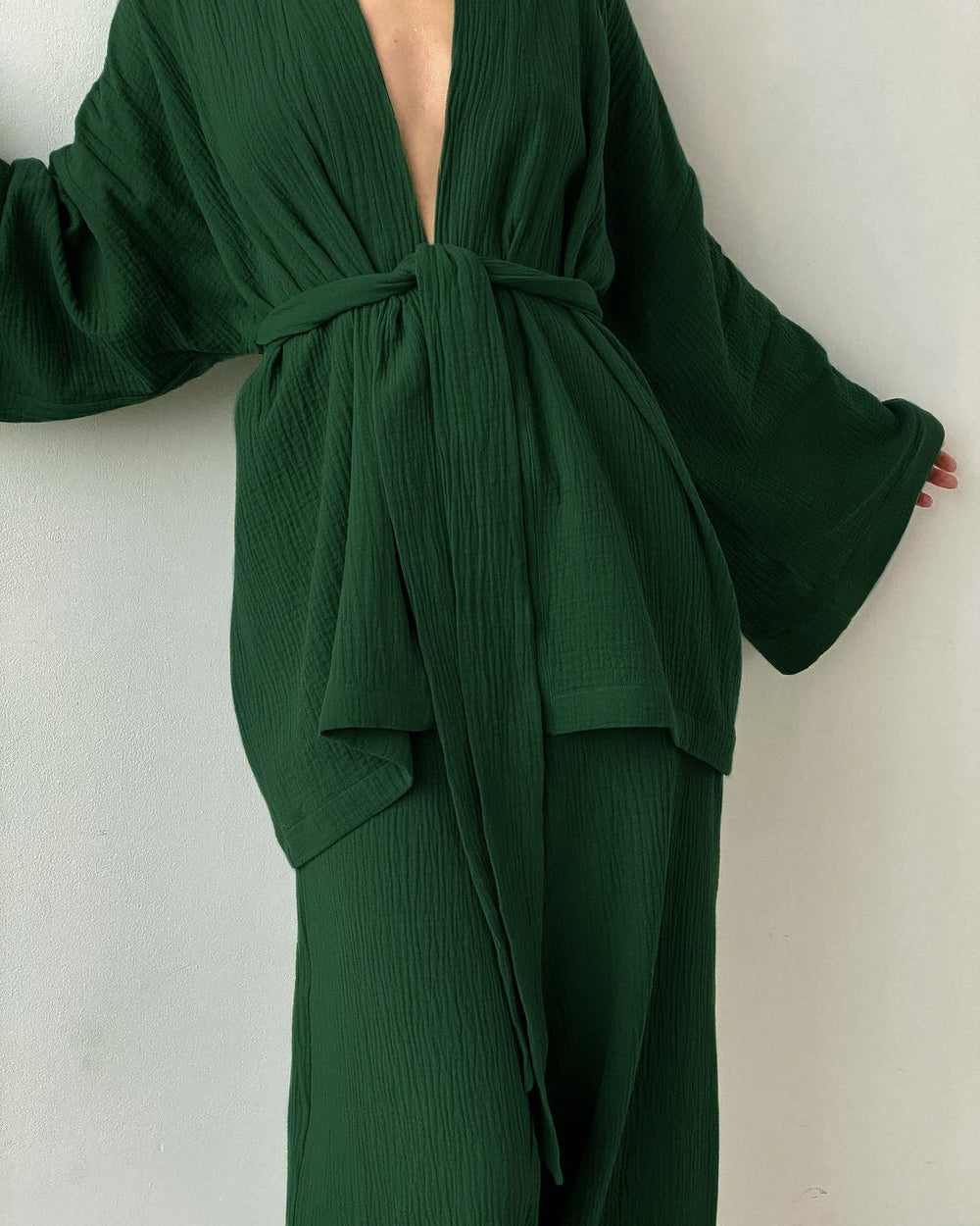 Ensemble deux pièces en crêpe vert avec haut à manches longues et pantalons amples